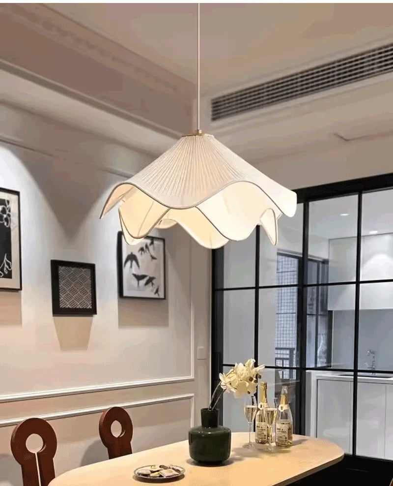 Bring a touch of modern elegance to your space with this Nordic Minimalist Pendant Lamp. Designed with a delicate white fabric flower shade, this chandelier adds softness and sophistication to any room. Its LED light source provides warm, energy-efficient illumination, creating a cozy and inviting atmosphere.